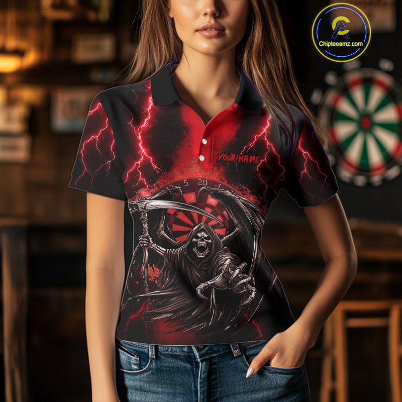 Personalized Red Grim Reaper Thunder Lightning Darts Shirt For Women, 3D Darts Team Jerseys TDM4588