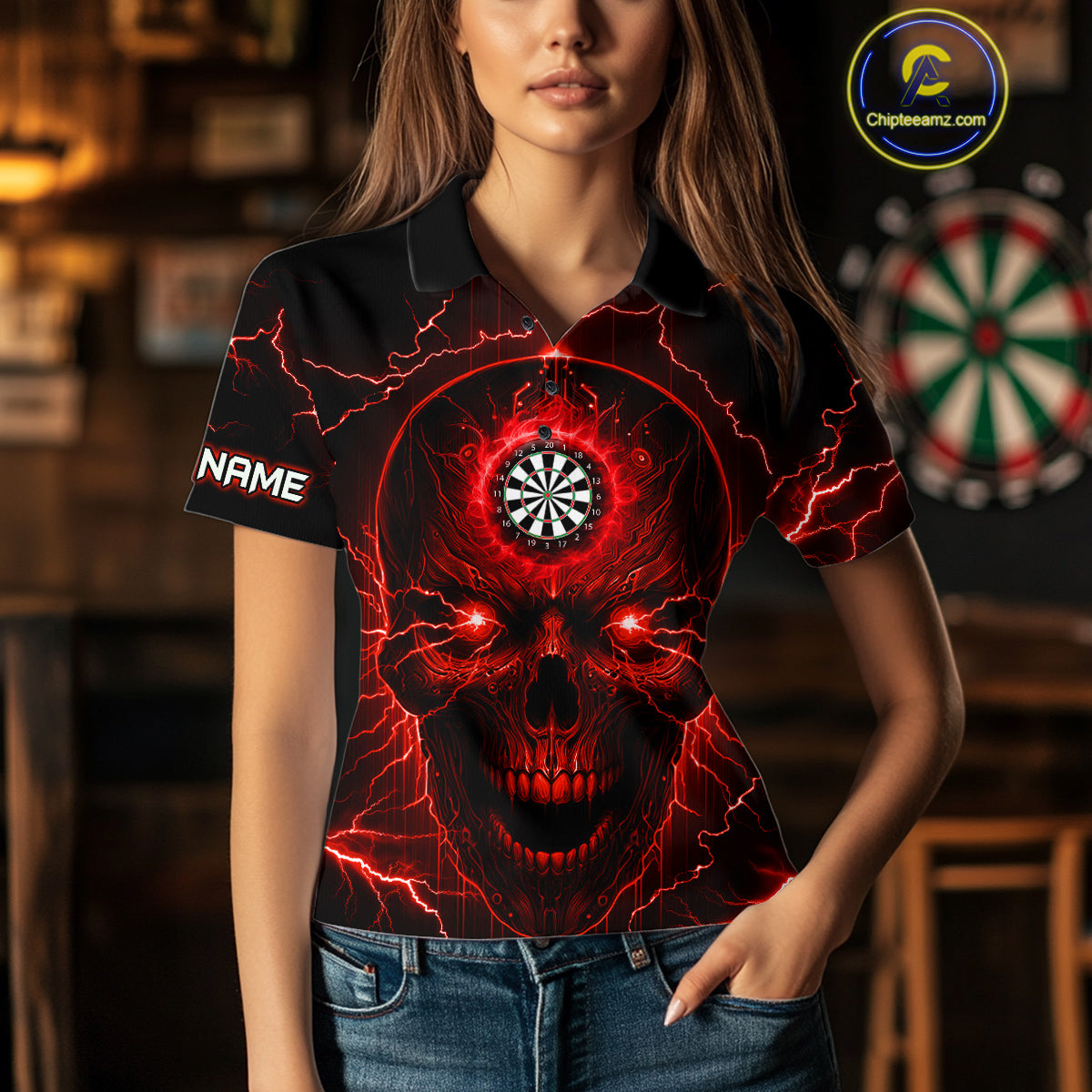 Personalized Red Darts Skull Shirt For Women Custom Polo & 1/4 Zip Lightning Thunder Darts Jersey TDM4621