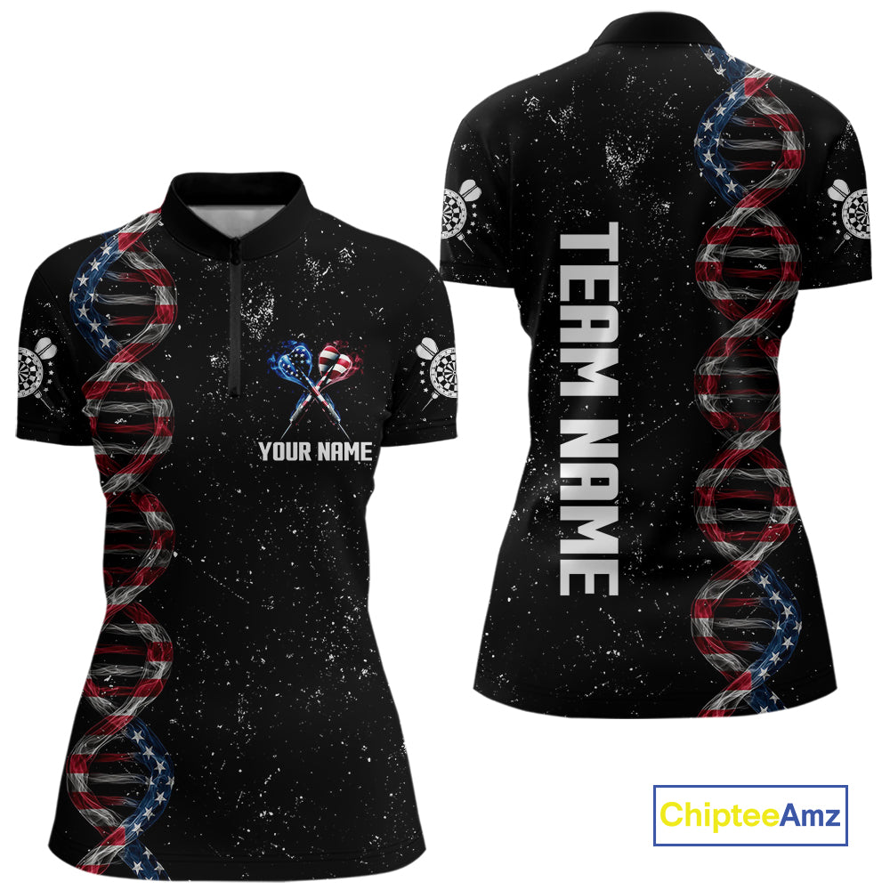Custom Women's Black Grunge DNA American Flag Smoke Darts Shirt, Patriotic Dart Jersey Polo, 1/4 Zip TDM4628
