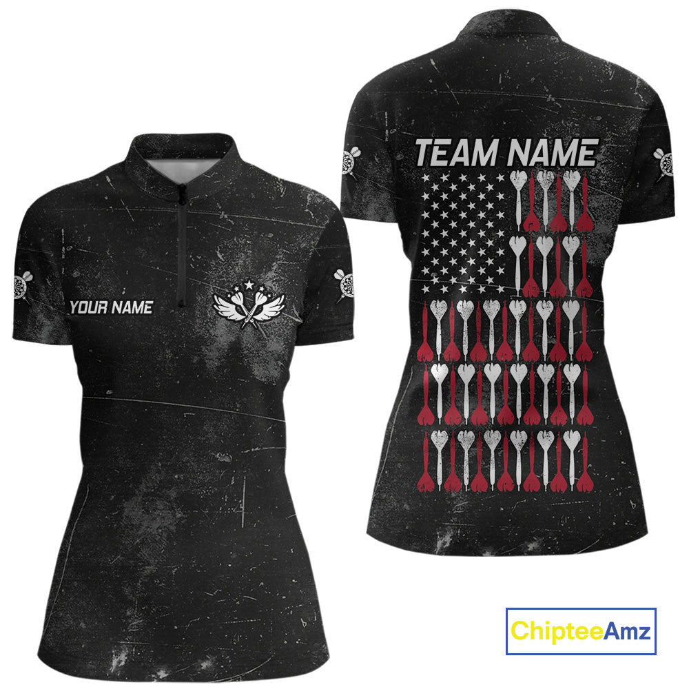 American Flag Black Grunge Darts Polo & 1/4 Zip Custom Darts Shirt For Women Patriotic Dart Jersey TDM4700