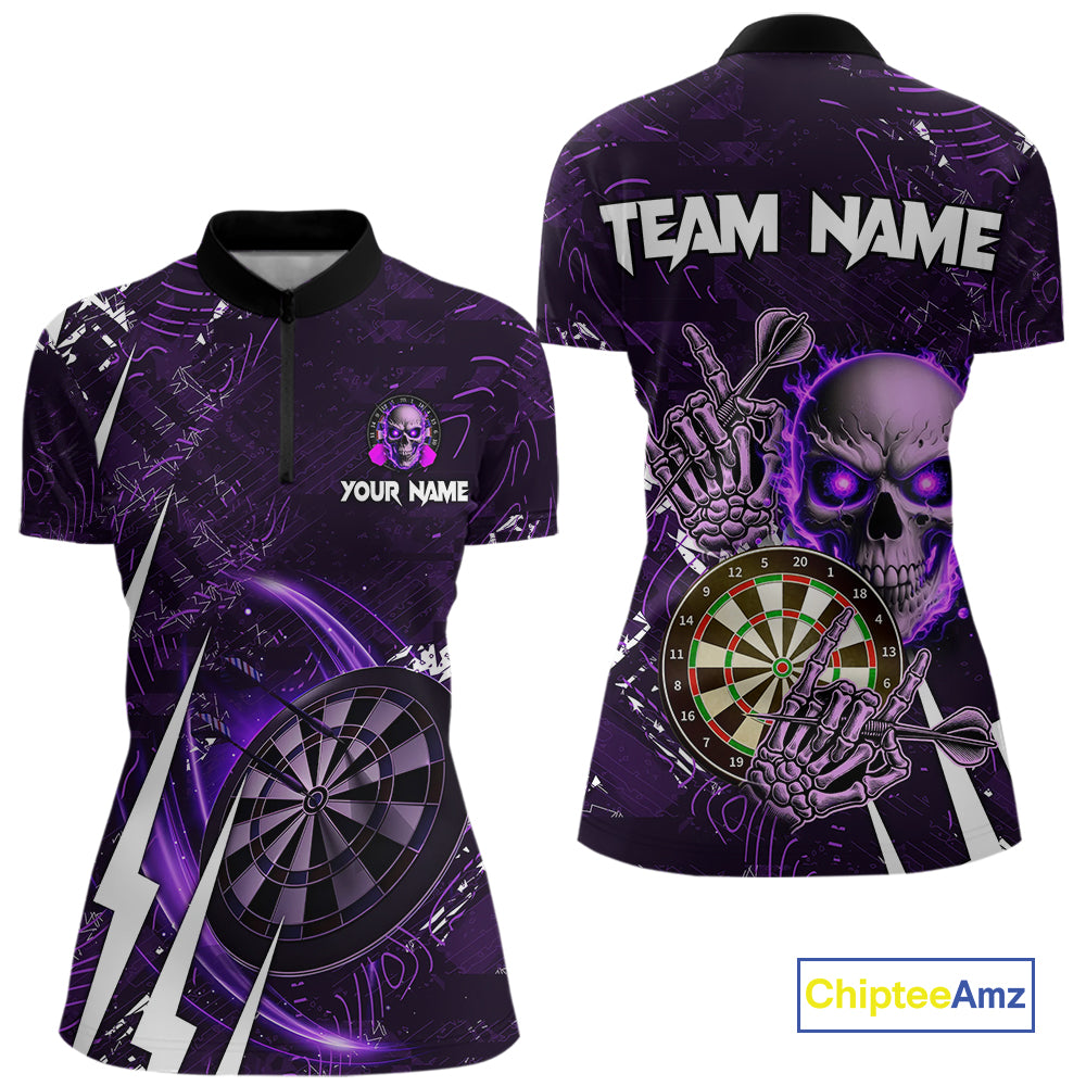 Purple 3D Skull Darts Polo & 1/4 Zip For Women Custom Darts League Team Jersey, Best Darts Gifts TDM4830