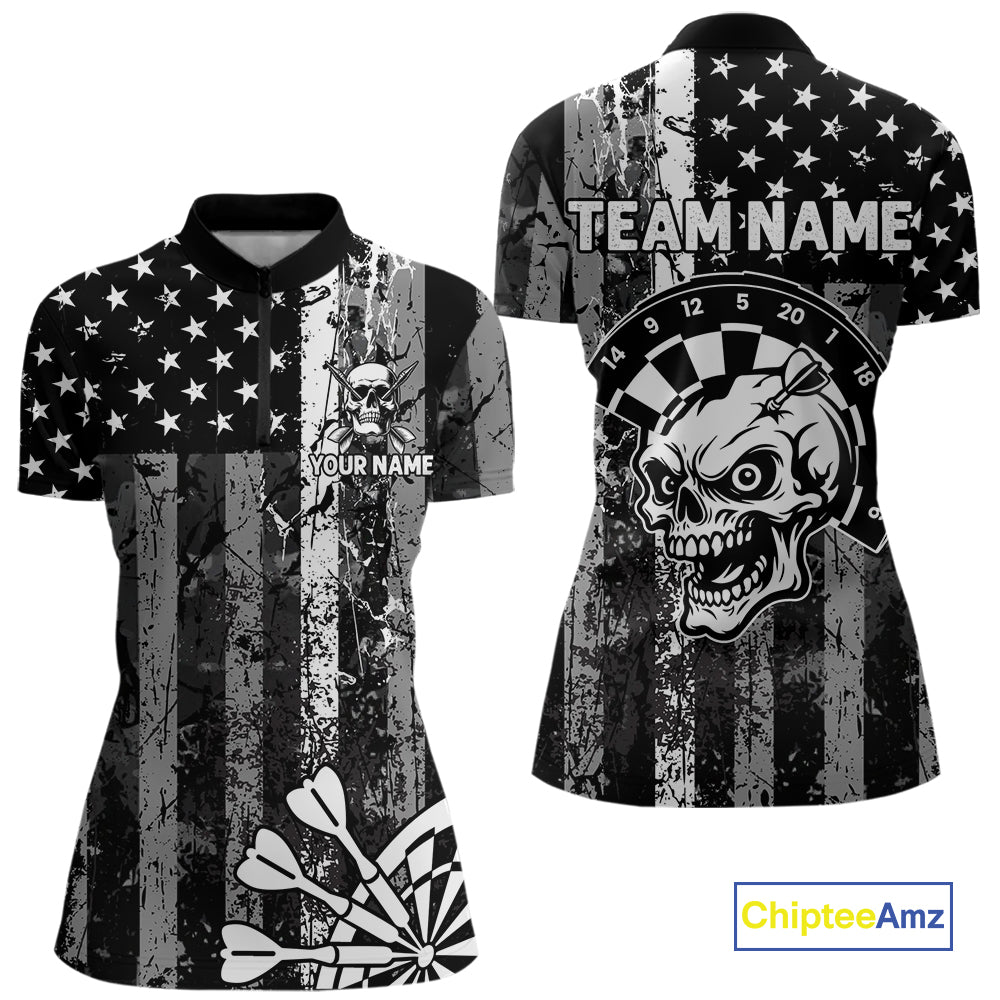 Personalized White Black Grunge US Flag Skull Darts Shirt For Women Custom Patriotic Darts Jersey TDM4883