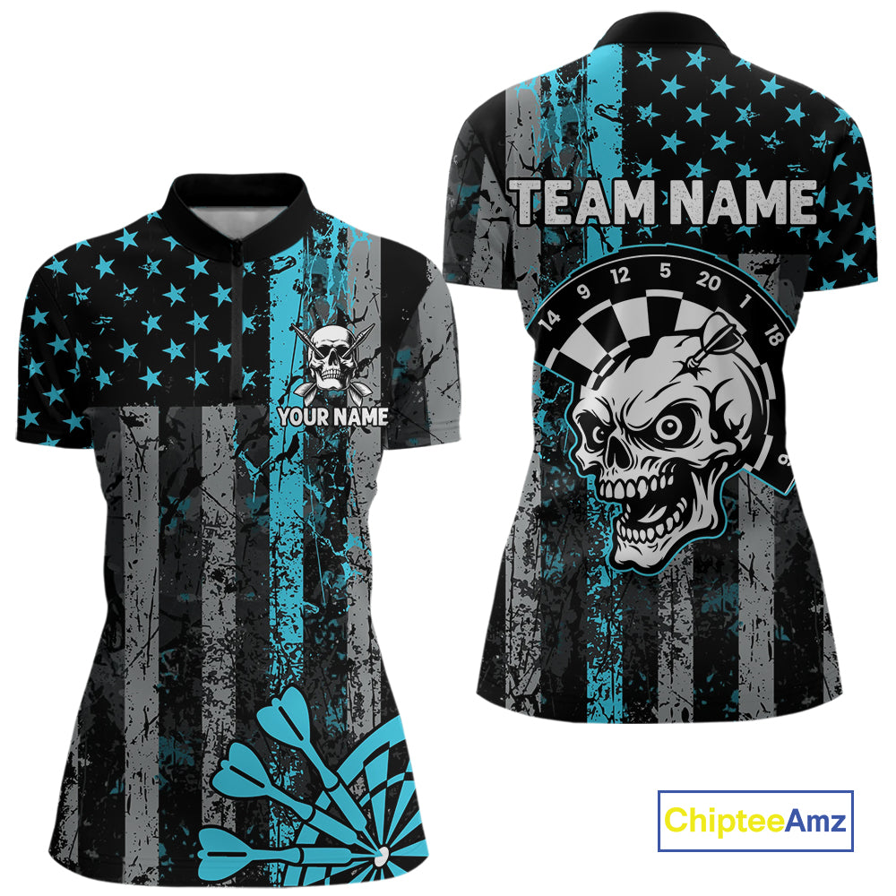 Personalized Blue Grunge US Flag Skull Darts Shirt For Women Custom Patriotic Darts Team Jersey TDM4885