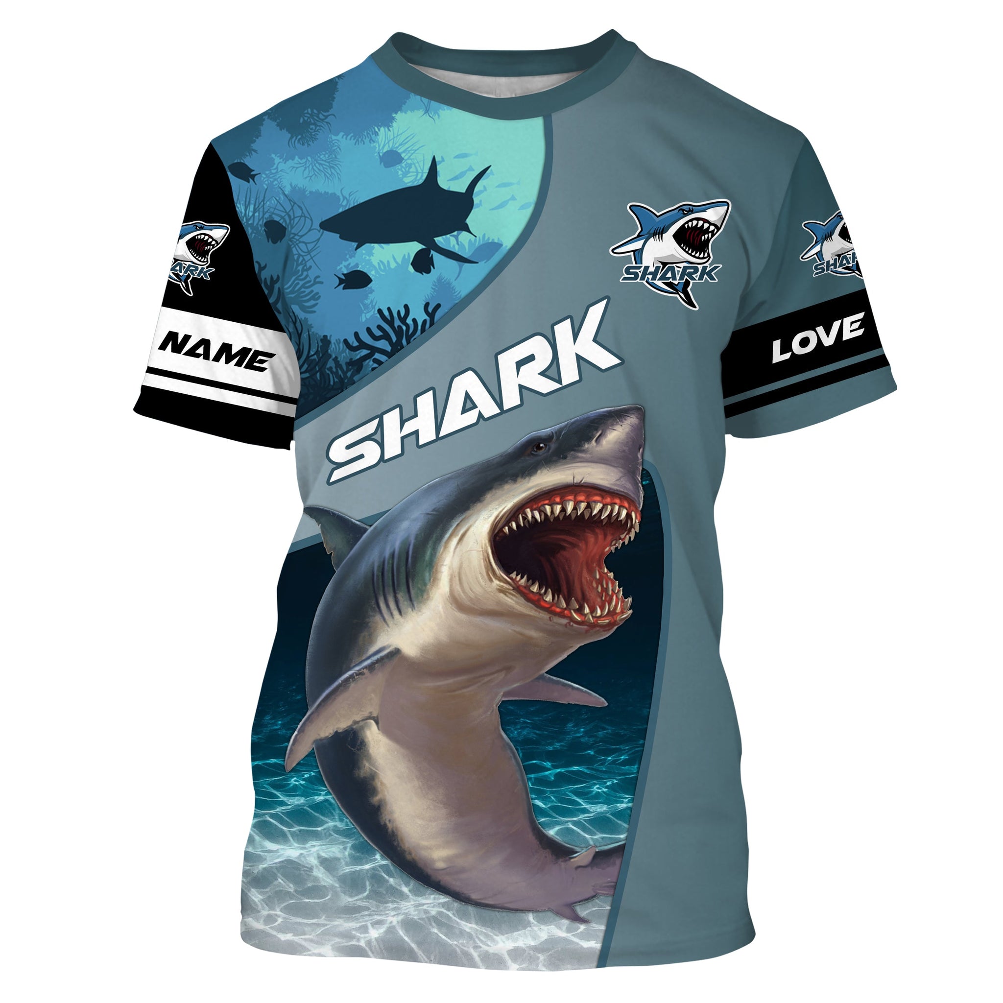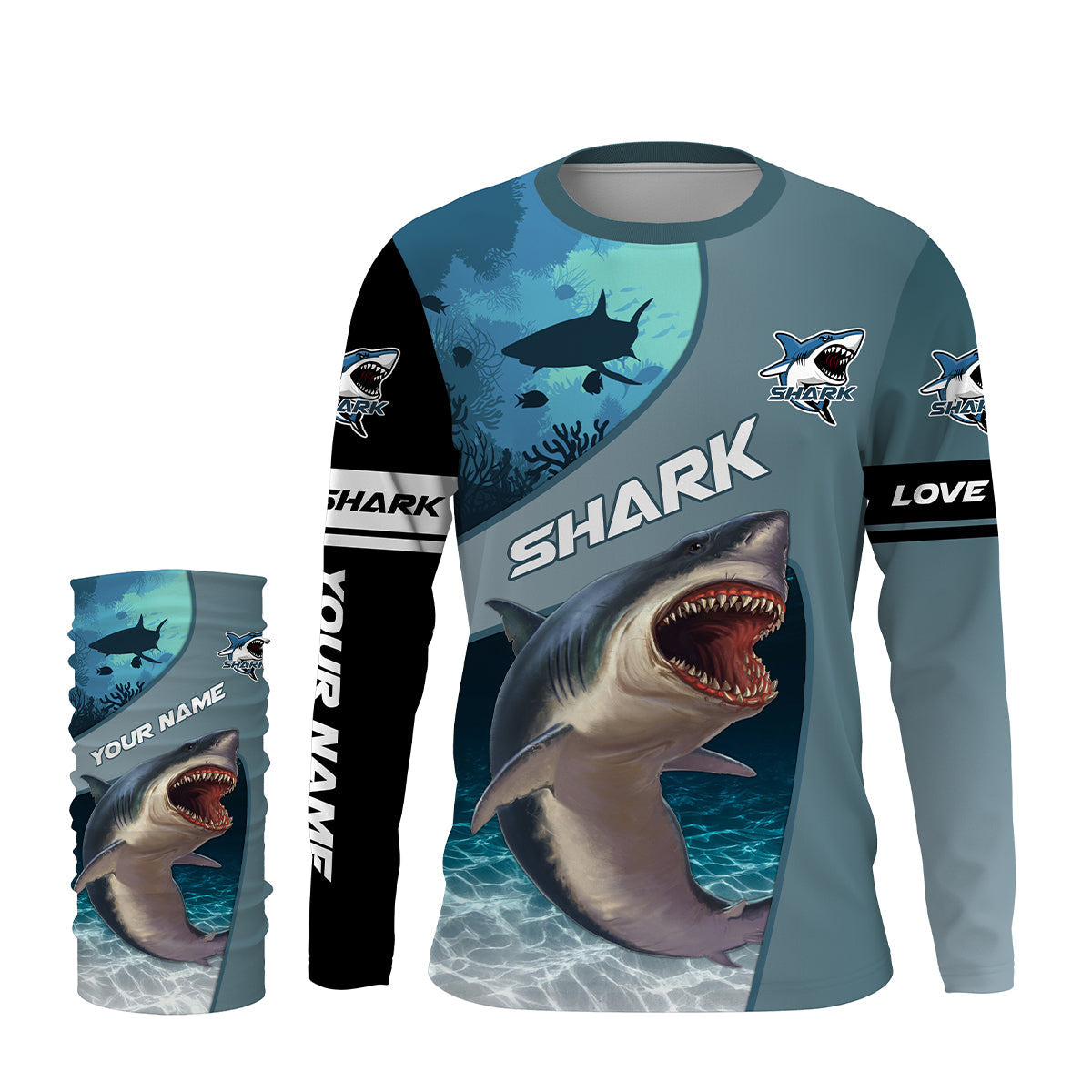 Shark fishing ocean blue color Custom Name 3D UV Protection long sleeve fishing shirts for men, women NQS3036