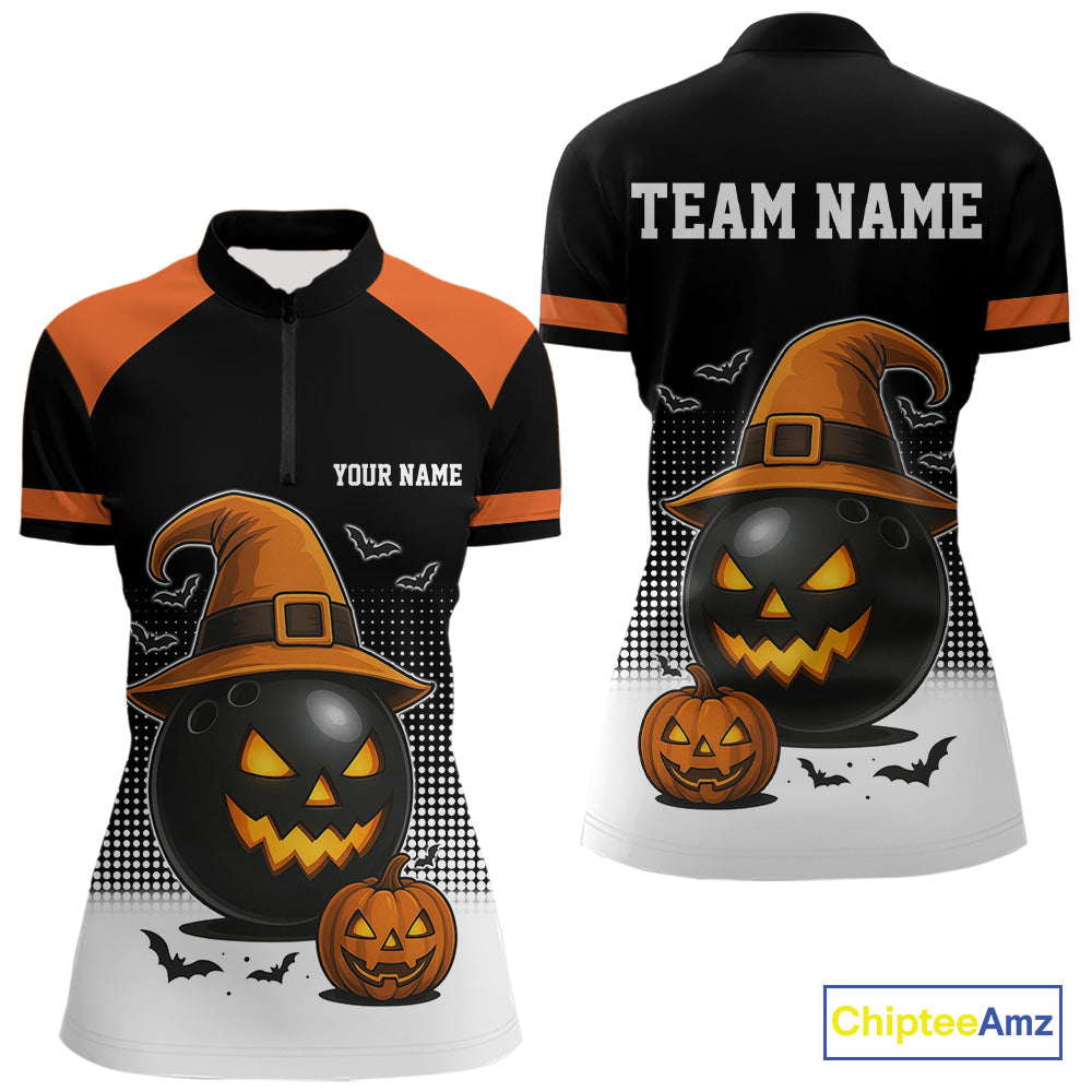 Black and Orange Funny Halloween Bowling Polo, 1/4 Zip Shirts For Women Custom team Bowling jersey NQS10780