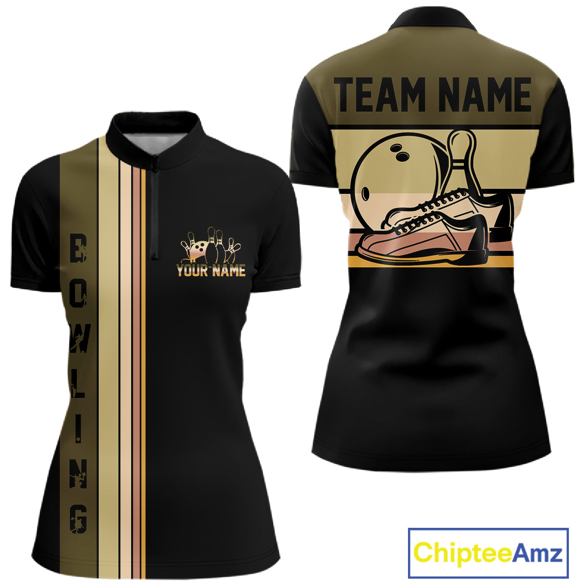 Black and Retro Bowling Polo, Quarter Zip Shirts for Women Custom Team Bowling League Jerseys NQS10745