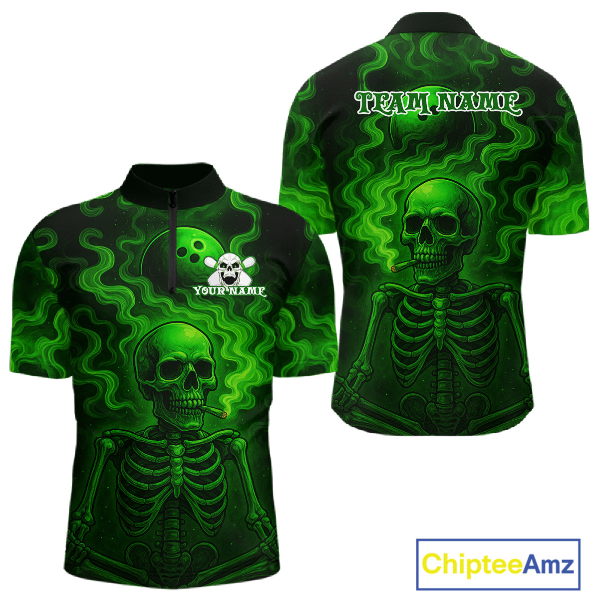 Custom Green Smoke Skull Bowling Polo, Quarter Zip Shirts For Men, Skull Team Bowling Jersey NQS10798