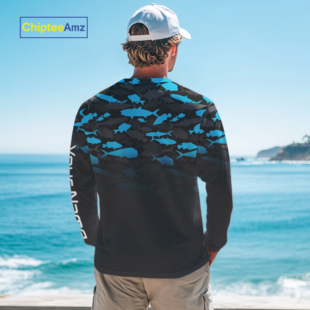 Fishing black and blue camouflage UV long sleeve hooded camo fishing shirts Custom fishing apparel NQS10600