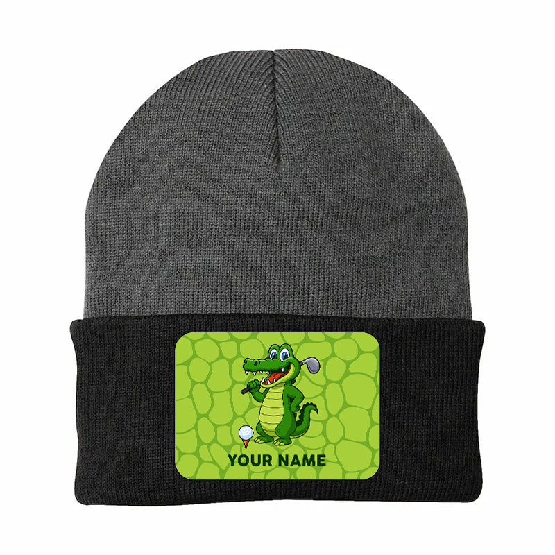 Funny Alligator Golf Knit Beanie Hat, Custom Name Rectangle Patch Golf Beanie Hat, Golf Gifts NQS10782