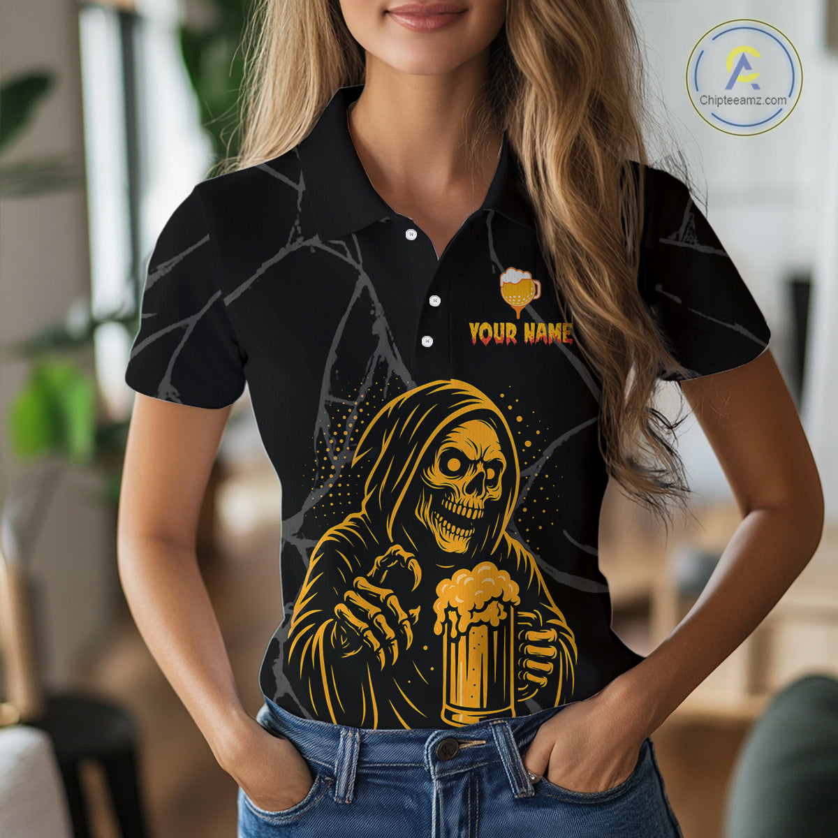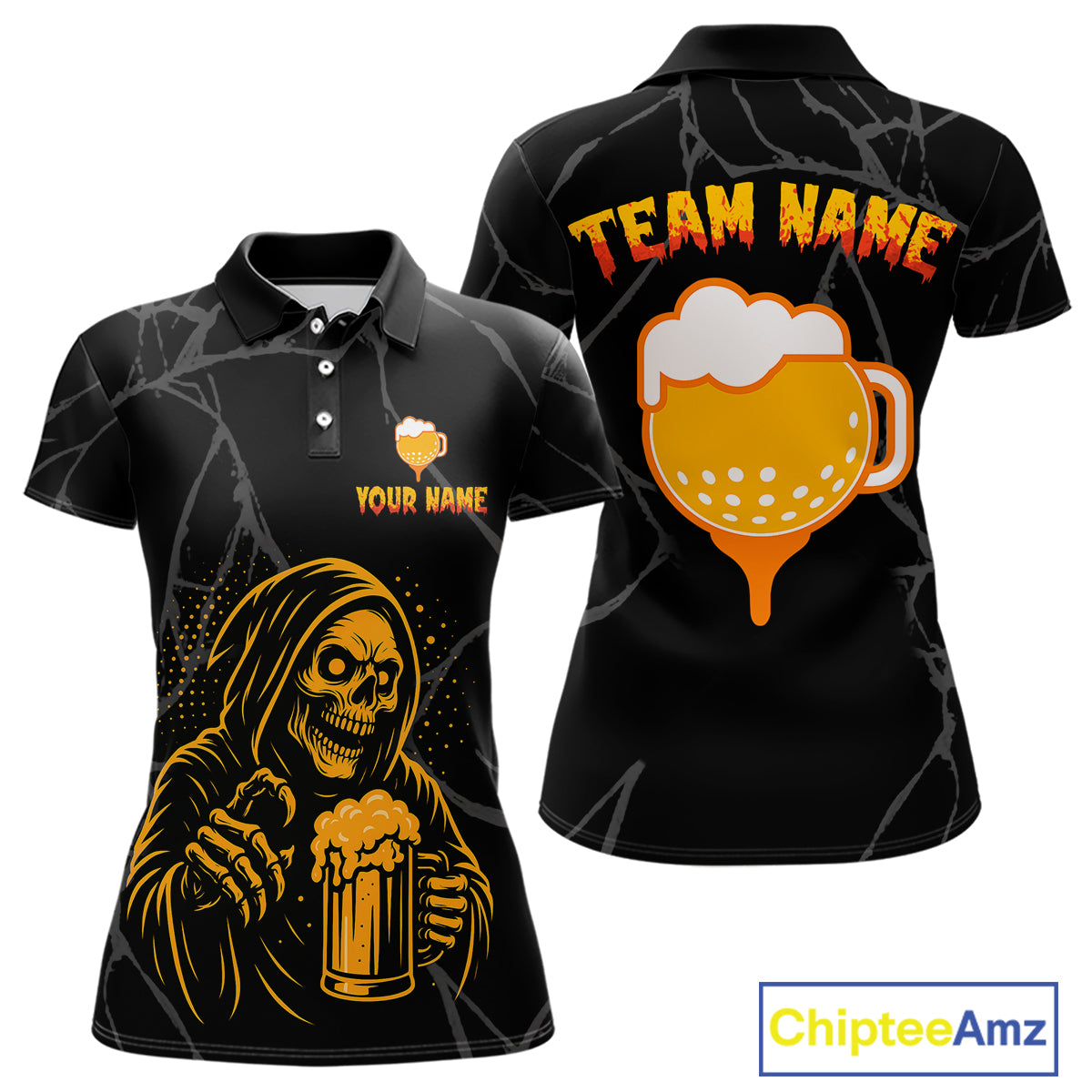 Golf and beer Women golf polo shirt Custom black and gold skull ladies golf attire Halloween outfit NQS10519