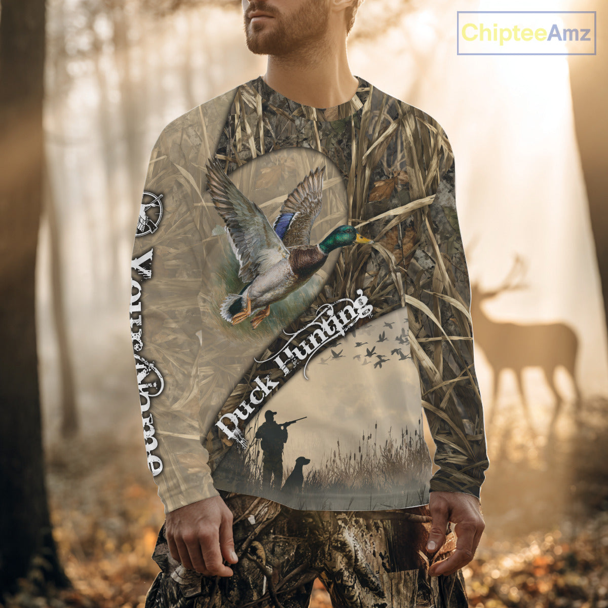 Designed for duck hunters and outdoor enthusiasts, this shirt combines style, comfort, breathability, and functionality in one. Featuring a unique waterfowl-inspired design, it can be personalized with your name, along with details like the American flag, realistic grass camo patterns, and even your loyal hunting dog – making it the perfect gift idea for hunters during duck hunting season.