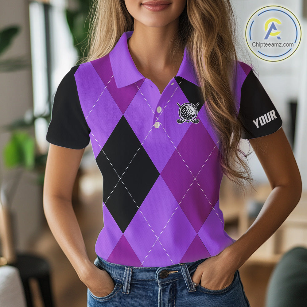 Womens golf polos shirts custom purple and black golf argyle plaid pattern, personalized golf gifts NQS10653